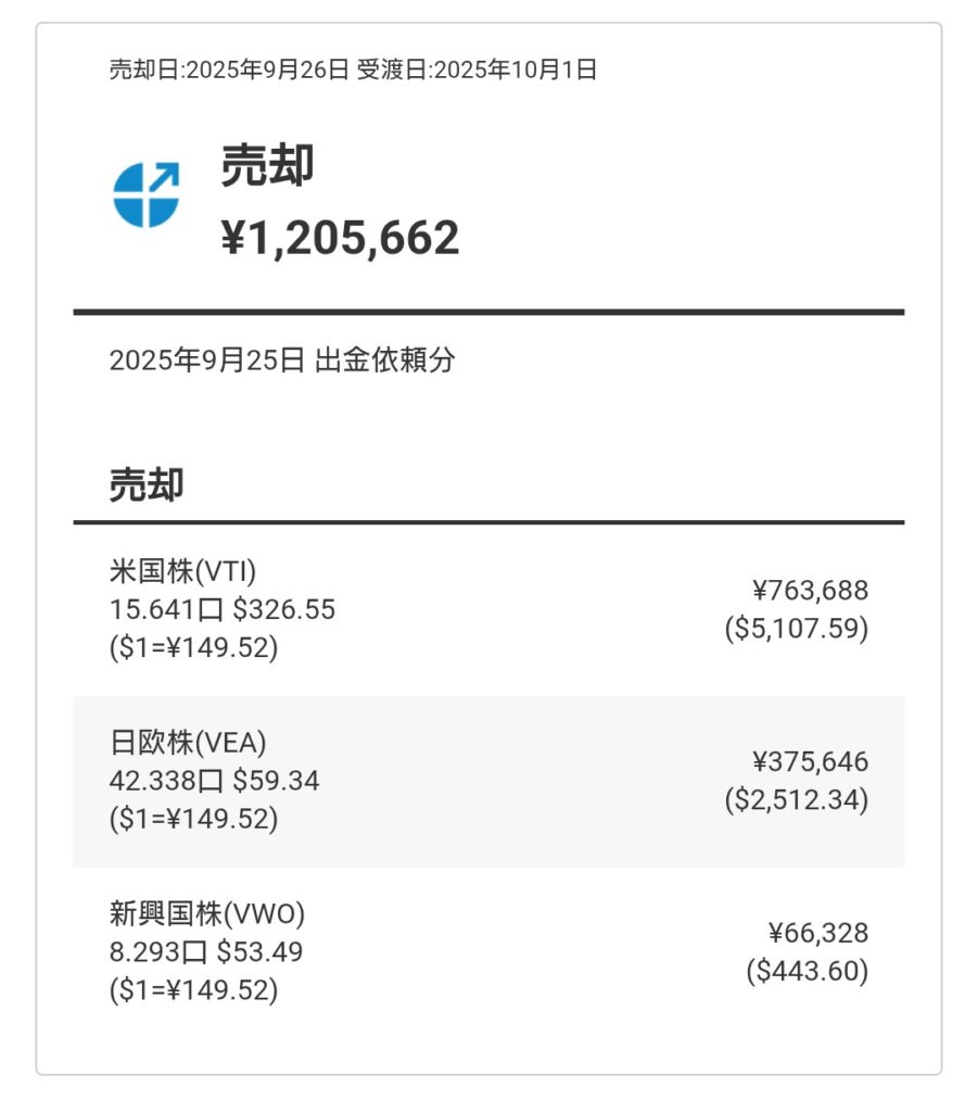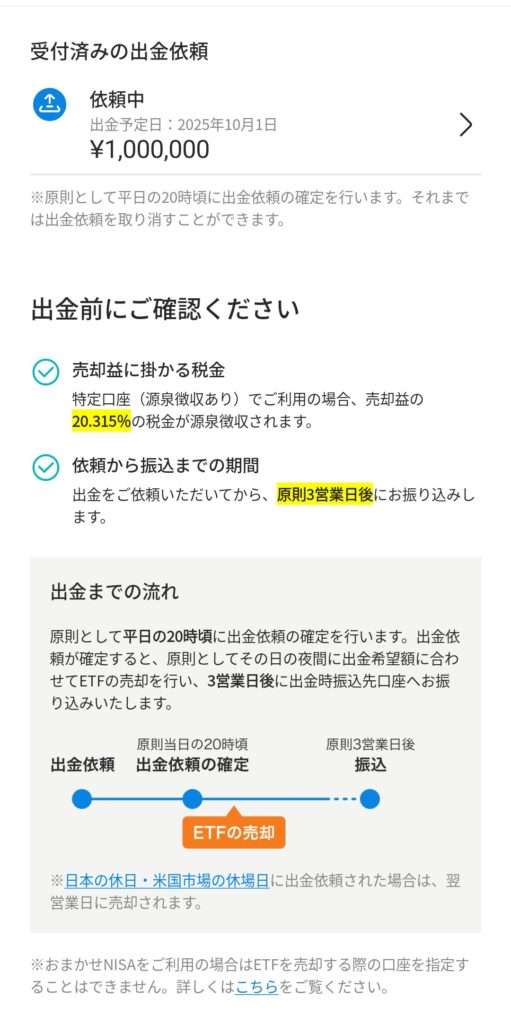 手続きが完了するとその日の夜間に出金希望額に合わせてETFの売却が行われる