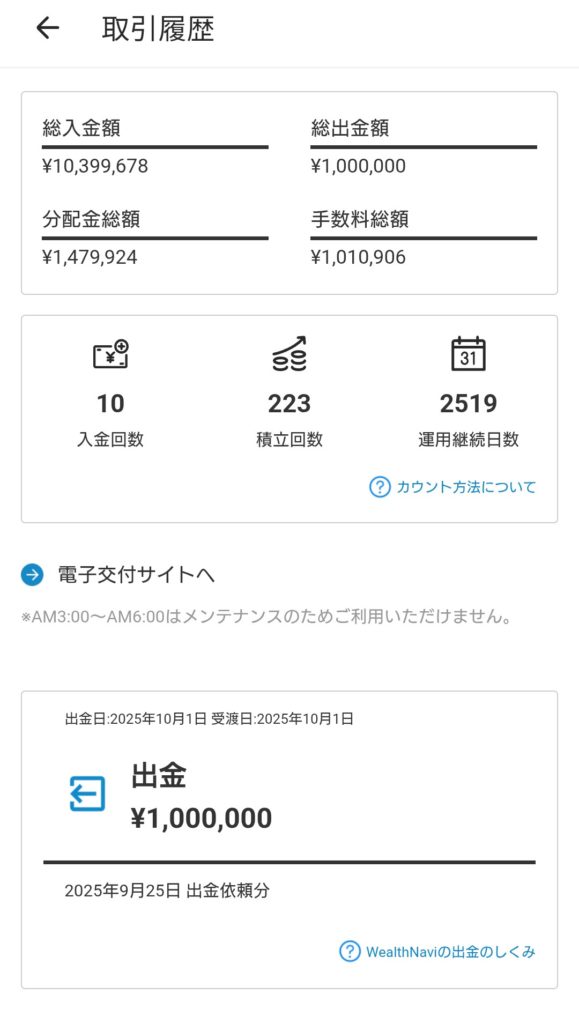 この資金は老後費用に置いておこうと思っていたんですが(今もそのつもり)、今年は教育費や娯楽費がかさみ金欠ぎみ・・加えて事業費の支払いも余裕がなくなっていたので、ウェルスナビの100万円分だけを出金してみようと決断。